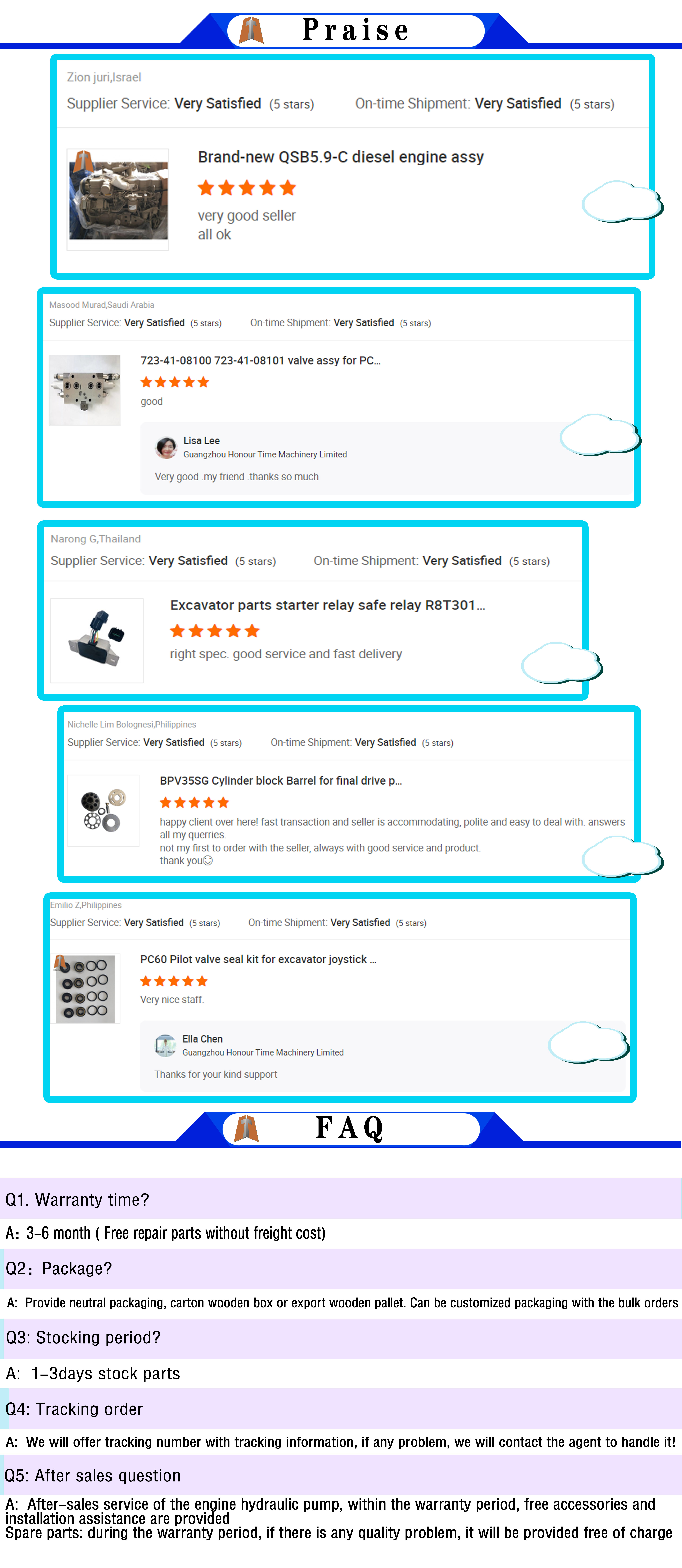 | related products | 1. Piston set 2. Liner 3. Piston ring 4. Main bearing 5. Connecting rod bearing 6. Trust washer 7. Full gasket kit 8. Water pump 9. Valve seal 10. Valve guide 11. Intake and exhaust valve 12. Turbocharger 13. Camshaft .... |
